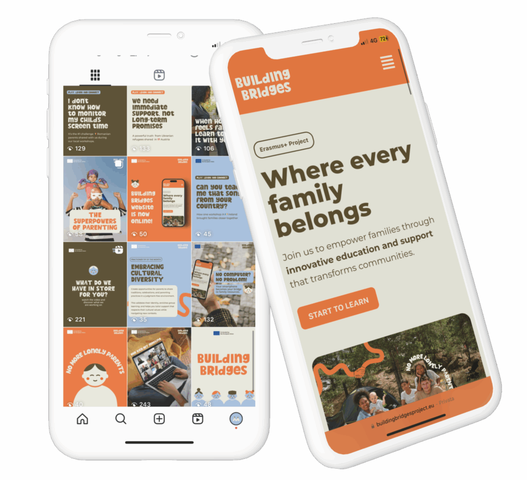 Building Bridges è un progetto europeo Erasmus+, questa volta dedicato alle famiglie migranti che hanno bisogno di sentirsi di nuovo a casa, aiutandole a ricreare attorno a loro una comunità intima, sicura e accogliente. Per questo tenerissimo progetto ho sviluppato un altrettanto tenerissima identità visiva, sito web e contenuti social, che ispirino le famiglie e le facciano sentire benvenute nella loro nuova casa. Le parole d’ordine di questo lavoro? Accessibilità, chiarezza, intimità.